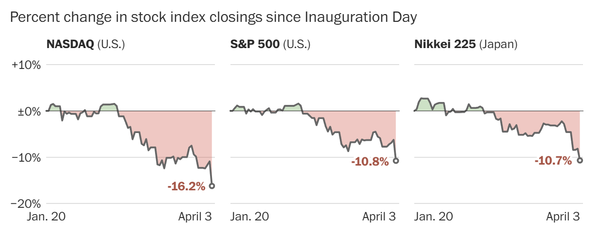 The Dow Jones Industrial Average DJIA has fallen by 11.9% since Inauguration Day, while the S&P 500 SPX was down 15.4% as of Friday's close.